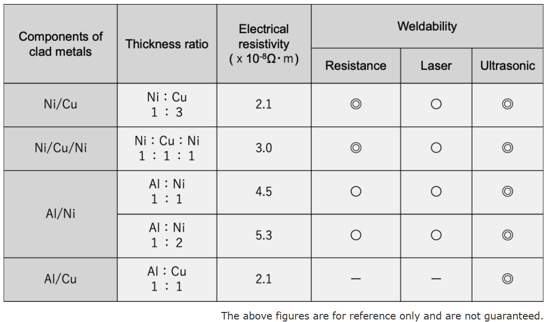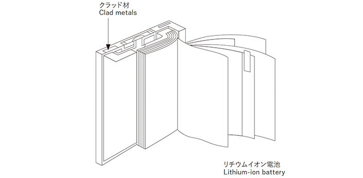 Besides high conductivity, these clad metals can be used for resistance welding and various other types of welding, and are useful for increasing the battery performance (higher capacity and smaller size) and improving productivity as well.