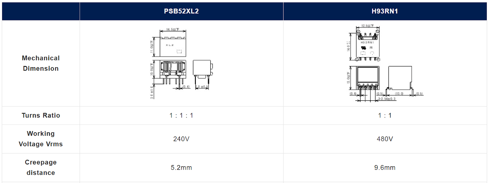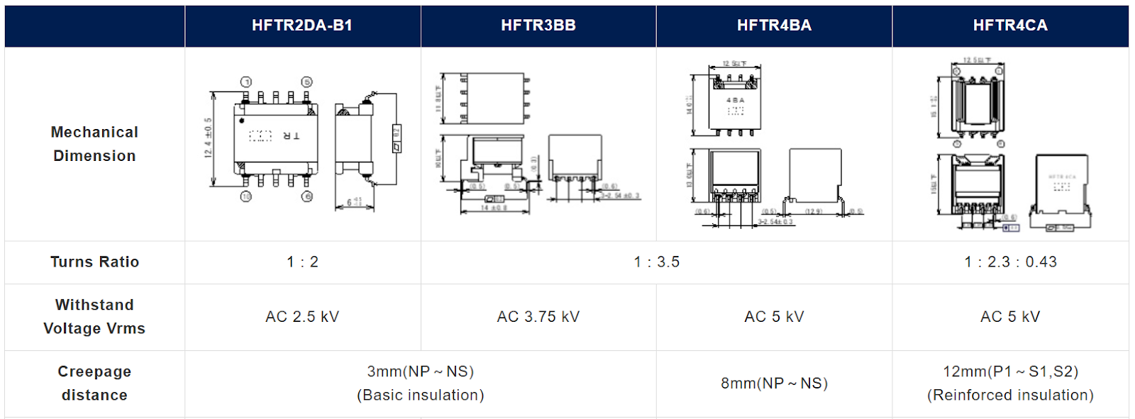 These transformers use ferrite cores that are less likely to saturate during high-temperature operation and employ our original isolating structure to achieve high dielectric strength and a compact body.
