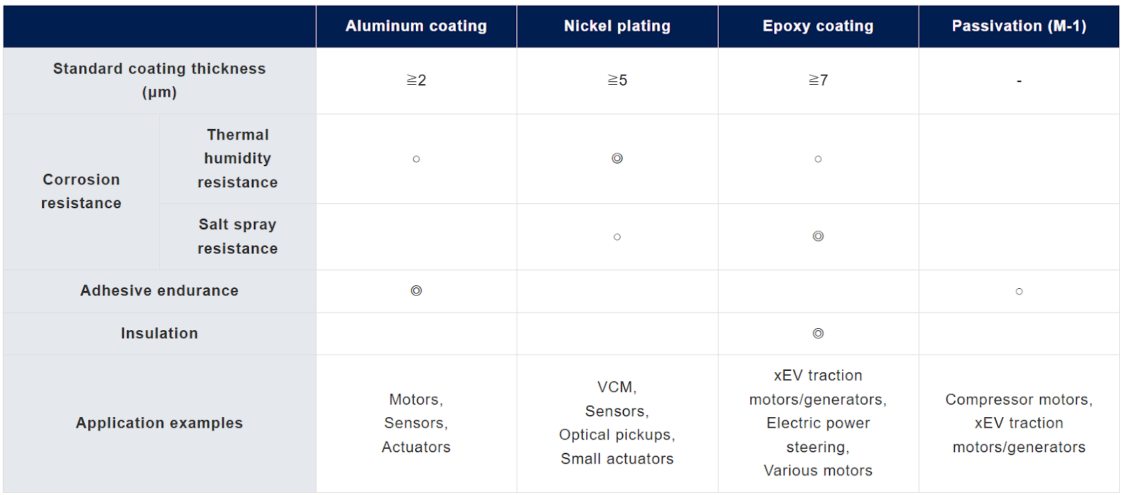 We offer a lineup of highly functional surface treatments (metal/resin) to meet the needs of a variety of usage environments. All of the surface treatments are excellent in corrosion resistance and adhesion. We offer aluminum coating, which has excellent adhesive endurance, nickel plating, which has a smooth surface and high film hardness, and epoxy coating, which has excellent insulation properties. In addition, M-1 coating, which uses our unique oxide film processing technology on the magnet surface, is slightly less corrosion resistant, but is popular for applications such as immersion in oil or refrigerants.