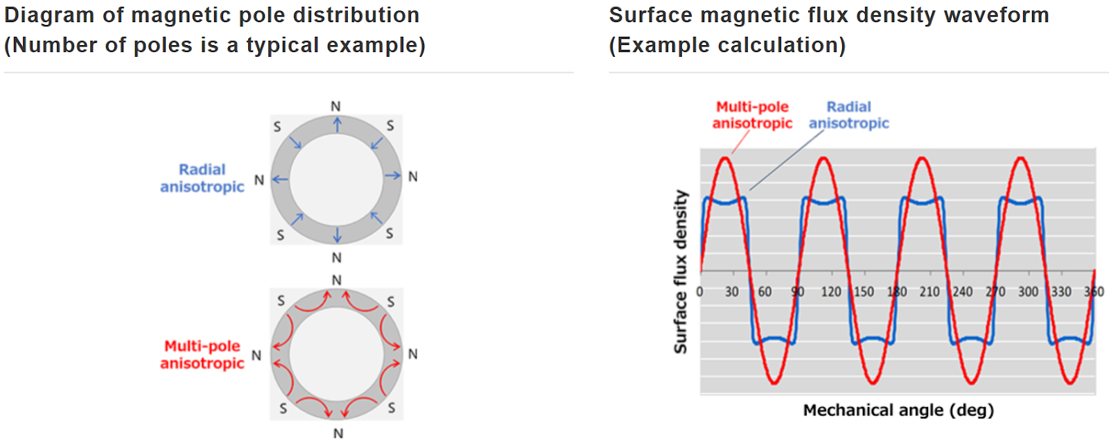 - The peak value of the magnetic flux density distribution is higher than that of radial anisotropic magnets.